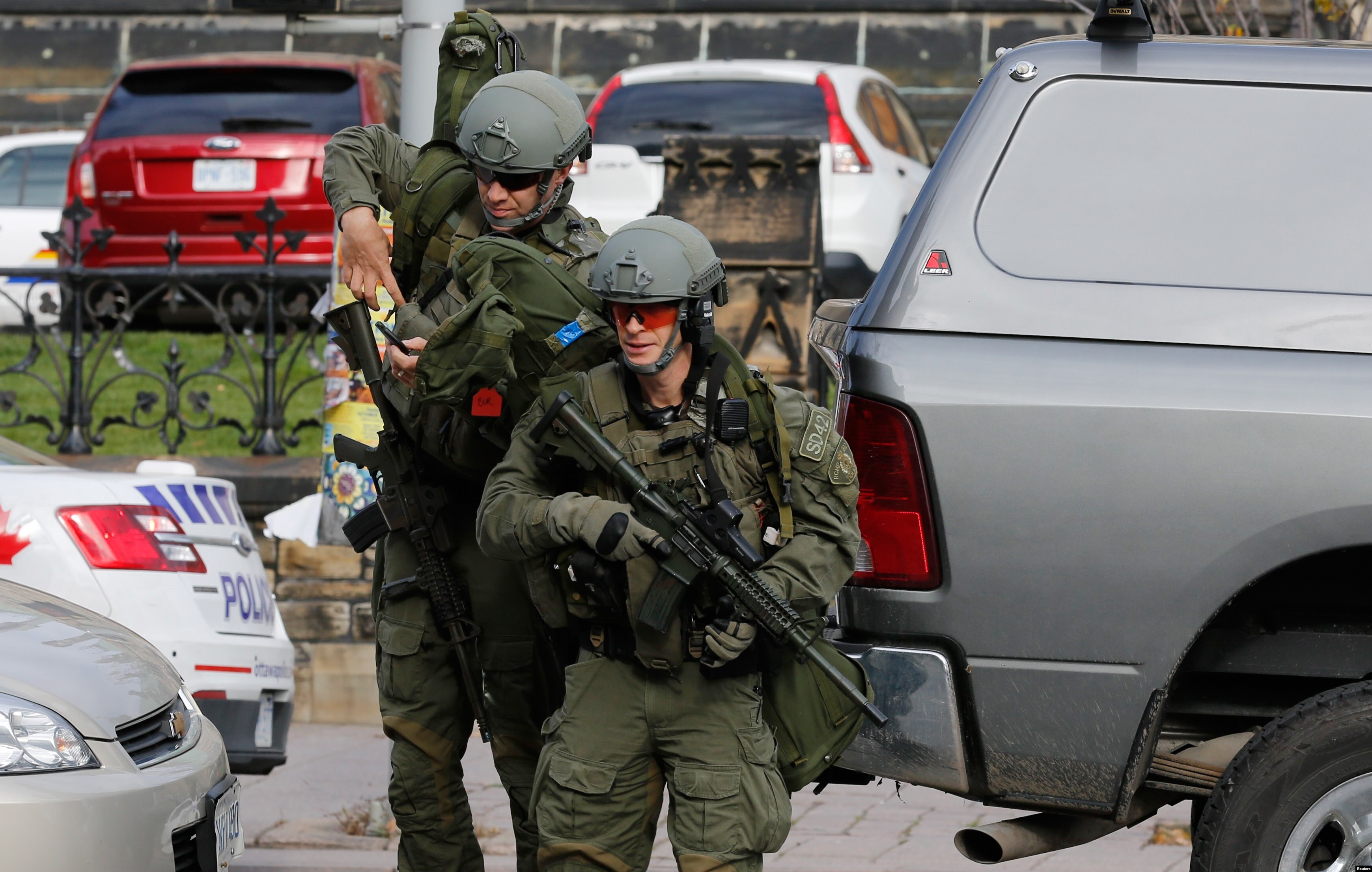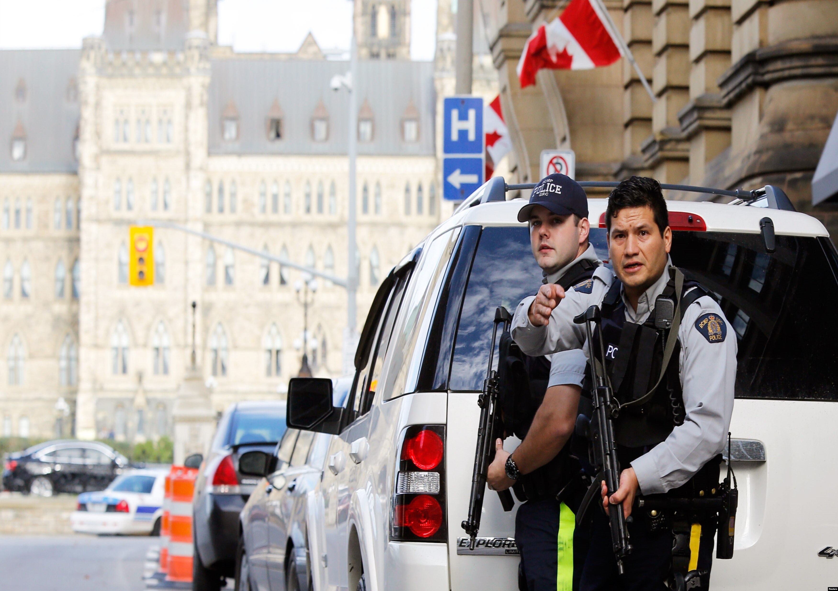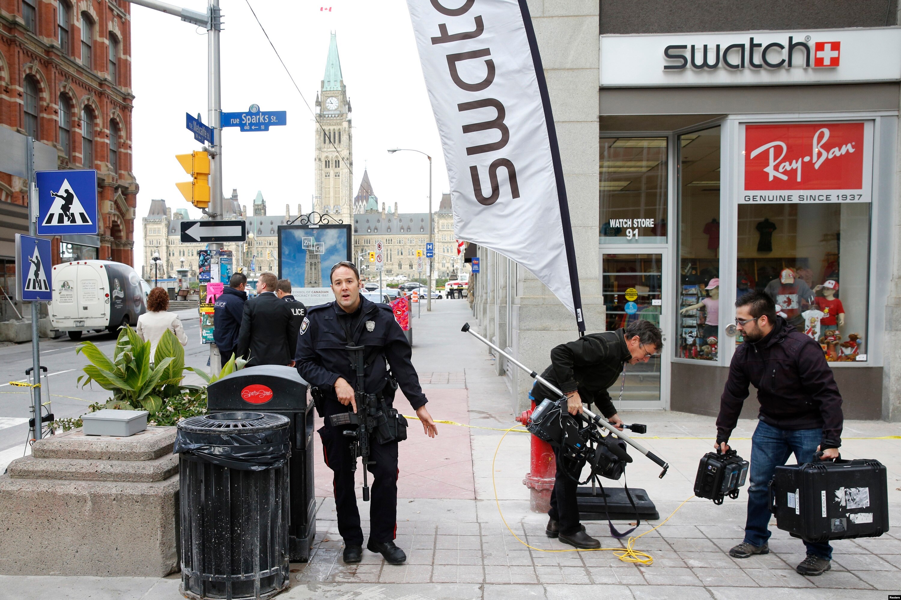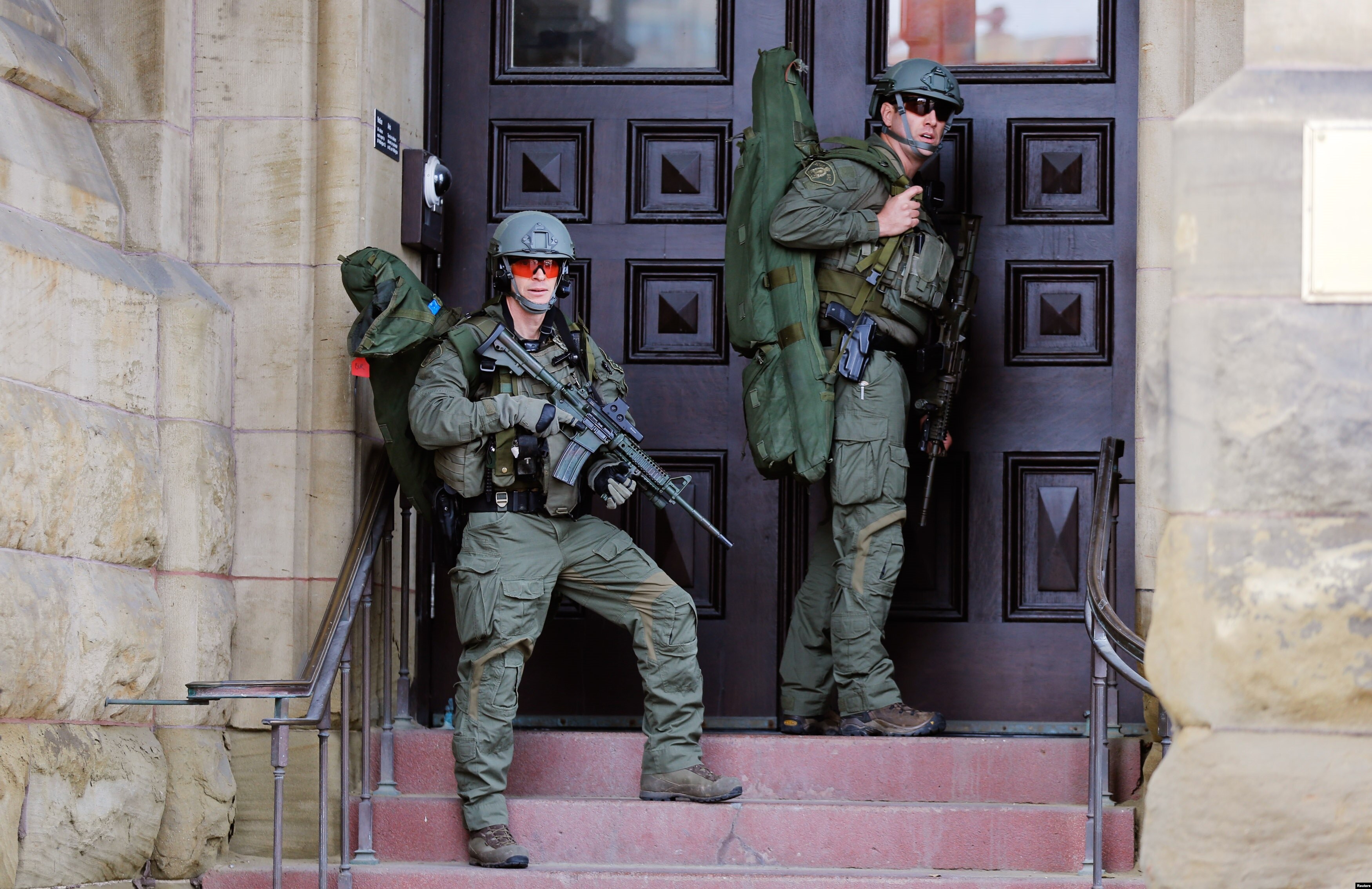 Heavily armed Canadian police backed by armored vehicles surrounded the parliament buildings and locked them down as they searched for the suspects. Ottawa police said shots also were fired at a nearby shopping mall.
