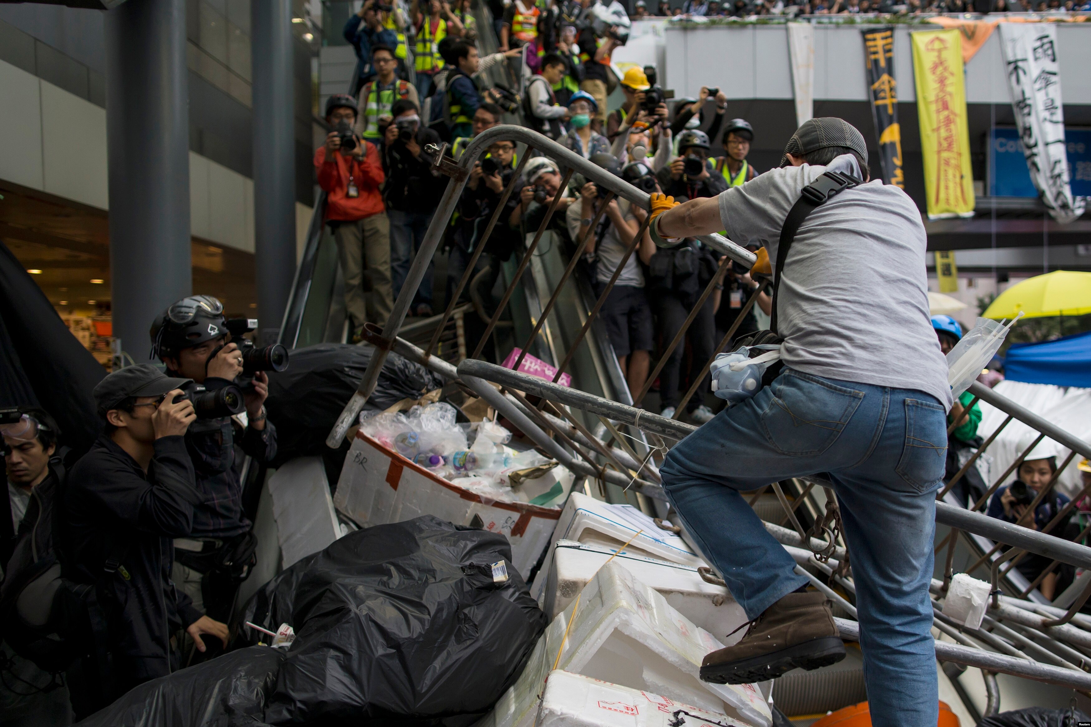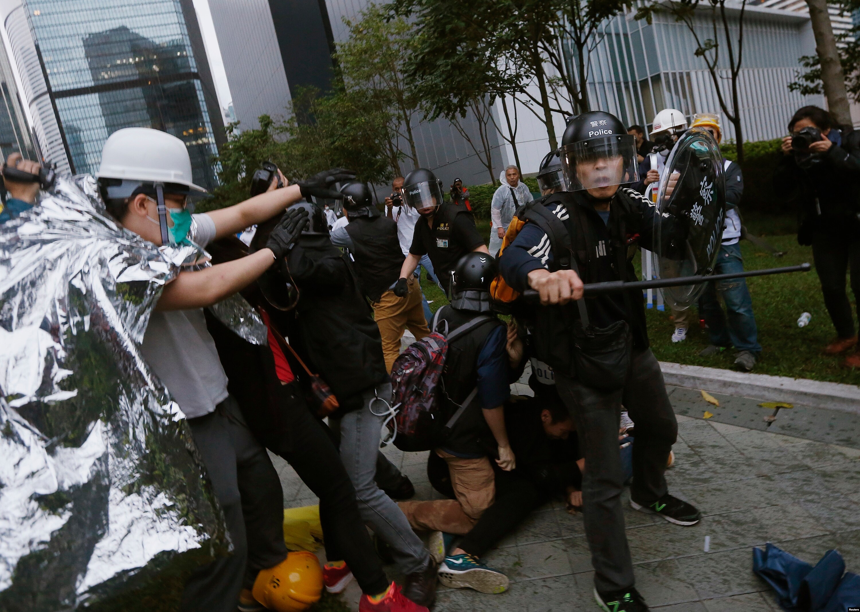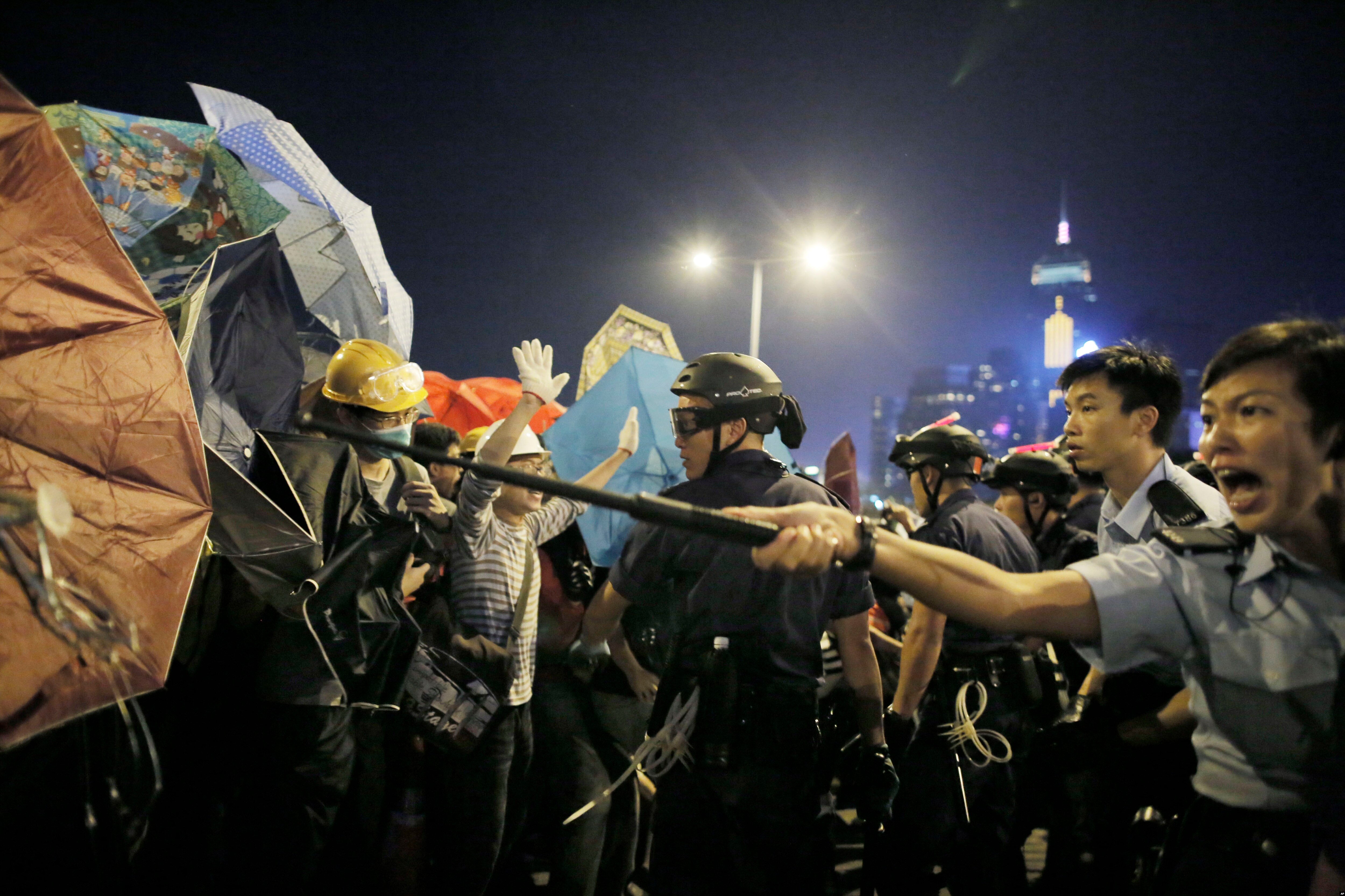 The clashes occurred in central Hong Kong after hundreds of demonstrators stormed past police lines in a bid to occupy a major road in the Admiralty district.